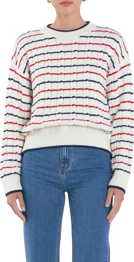 Spirited stripes decorate this slouchy wool-kissed sweater knit with casual dropped shoulders and chunky cable stitches.