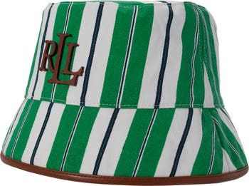 Prep up your look with the jaunty stripes that brighten this canvas bucket hat stamped with the brand's iconic logo in rich leather.