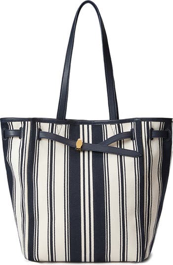 A large interior capacity with zip and slip pockets enhances the organizational appeal of a striped canvas tote. An adjustable belt cinches the topline to secure your items while on the go.