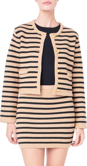 Gleaming goldtone buttons elevate this cozy wool-kissed cardi knit in a slightly cropped silhouette with allover stripes.