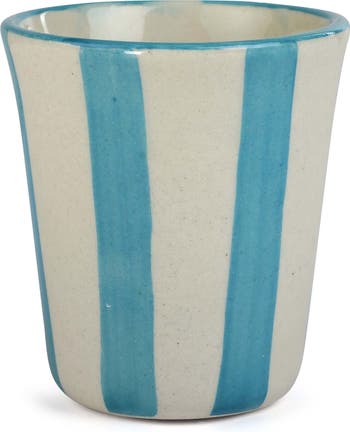 Add a bold splash of color to your tabletop spread with this ceramic drinking glass painted with wide vertical stripes.