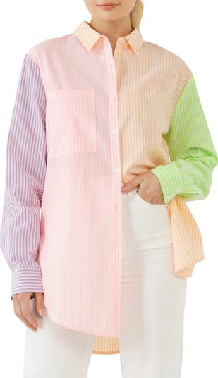 A color-blocked design in bright sherbet hues distinguishes a button-up shirt cut from a crisp cotton blend with a relaxed, oversized fit.