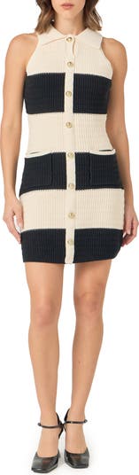 A crochet-inspired knit made of a soft cotton blend gives texture to this boldly striped minidress made with handy pockets and gleaming buttons.