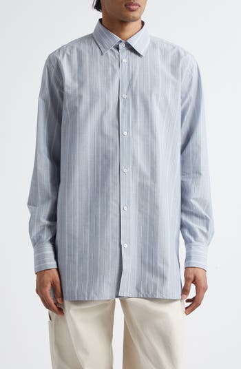 The maison reimagines classic tailoring with this Italian-crafted striped cotton button-up designed with side vents and a relaxed silhouette for a modern, easygoing edge.