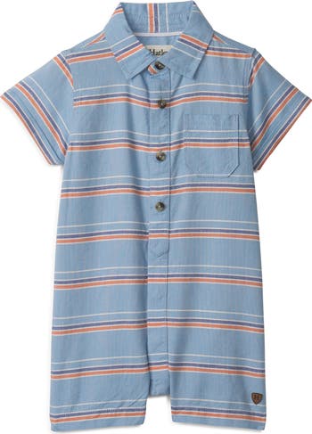 Your active baby will be outfitted for a busy day of play in this zippy-striped romper made from soft cotton chambray.