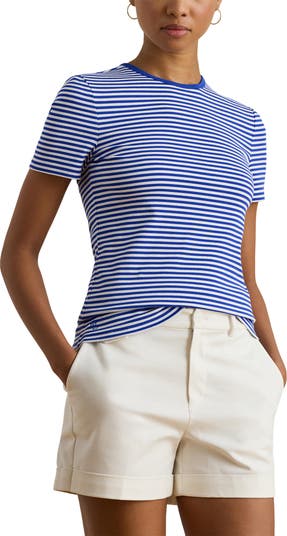 Lively pencil stripes encircle a trim, stretch-added cotton T-shirt finished with a ringer neck.