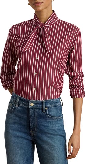 A neat tie at the neck lends polish to any look in this button-up shirt made from cotton broadcloth and punctuated with crisp vertical stripes.
