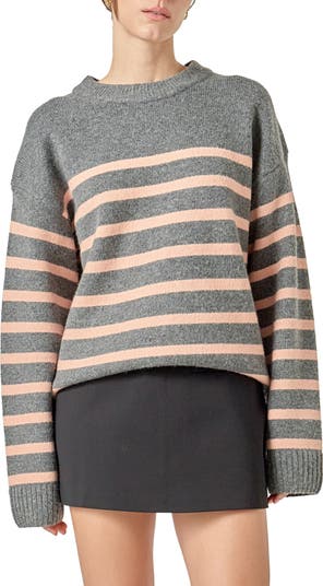 Dropped shoulders relax this stripe crewneck sweater knit for a comfortably slouchy fit that surrounds you in cozy warmth.