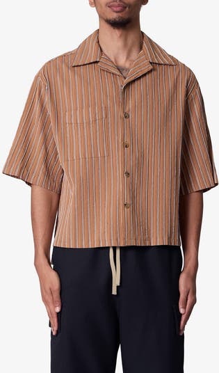 This striped, casual-cool camp shirt gets a fresh look from a boxy, slightly cropped fit and a chest pocket on the opposite side.