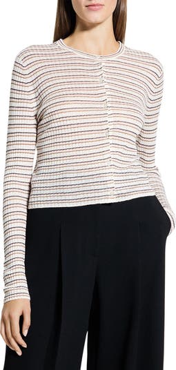 Horizontal stripes highlight the fine vertical ribbing of this cropped cardigan knit from lightweight linen-blend yarn.