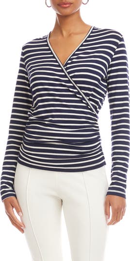 Rippled ruching and a wrapped-inspired front shapes the silhouette of this soft stretch-kissed top encircled in classic stripes.