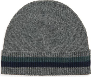 A striped cuff adds simple detail to this ribbed beanie letting the luxuriously soft, warm cashmere take center stage.