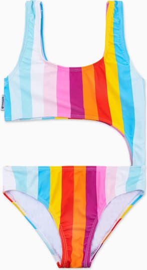 Take off in this multicolor striped one piece swimsuit with its asymmetrical side cut-out and bold colors.