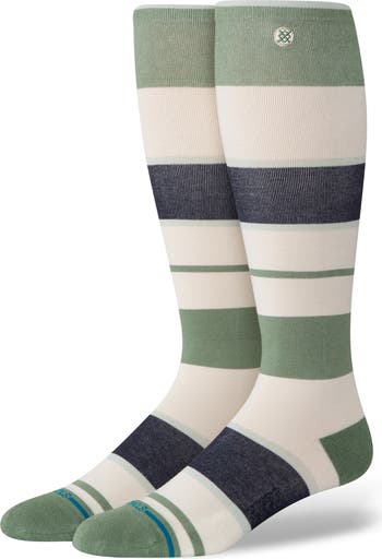 Bold stripes highlight this pair of over-the-calf socks crafted from a stretchy blend that offers light compression for all-day comfort.