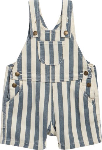 Introduce a bold workwear twist to baby's wardrobe with these cotton-denim shortalls covered with conductor-style vertical stripes.