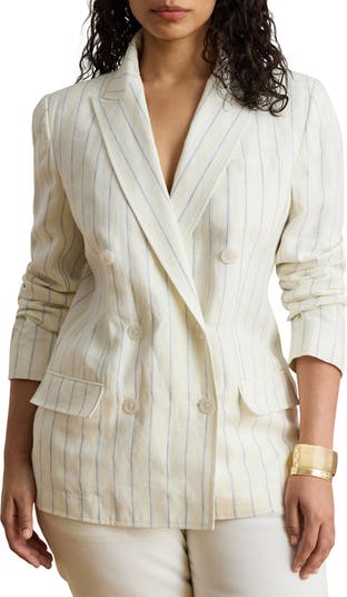 A double-breasted silhouette bring timeless style to a striped blazer polished with peaked lapels and made from lightweight linen.