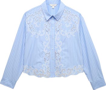Fine pinstripes bring a smartly tailored vibe to this cotton button-up, while intricate embroidery and a scalloped hem add a playful finish.