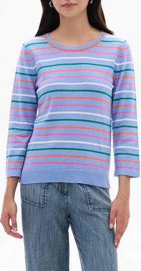 Blanket-stitch embroidery outlines the casual crewneck of this three-quarter-sleeve T-shirt made of breezy cotton.