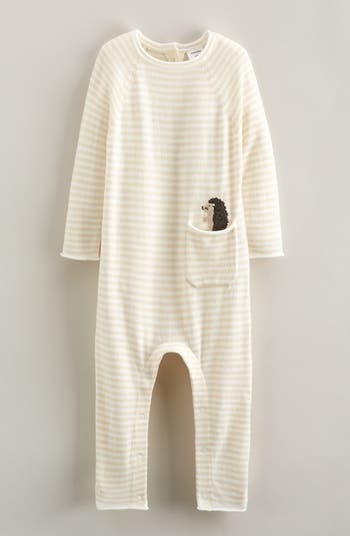 A tactile embroidered hedgehog appears to pop up from the pocket of this striped sweater-romper knit from a soft cotton-blend.