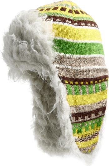 Bring a vibrant pop of color and cozy texture to your cold-weather looks with this Fair Isle trapper hat knit from wool and lined with fluffy wool lining.