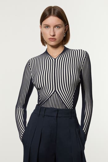 Elevate your day to night wardrobe in our long sleeve top, with a fitted silhouette, and striking stripe body contouring patterning. Style it with tailored trousers or jeans and strappy heels for an elevated day to night look. Stripe Fitted Long Sleeve Knitted Top features high quality soft knit fabric in a bodycon silhouette.