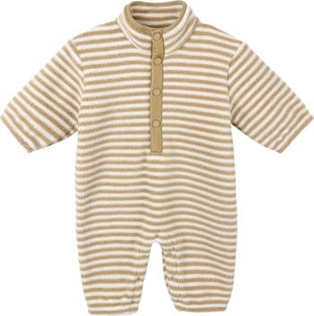 Your little one will stay cozy on chilly days in this henley-inspired romper cut from soft and snuggly fleece.
