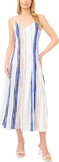 Watercolor stripes boost the beachy charm of this airy linen-kissed sundress framed by a fluttery godet-inset skirt.