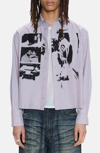 Vertical stripes set the foundation for this cotton-blend button-up shirt finished with bold overprint graphics with edgy contrast.