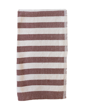 This best-selling, 14” x 28” chocolate stripe hand towel is 100% organic cotton & can find many uses around the home. The texture, handmade quality, and 1” horizontal natural stripe, set this hand towel apart. Spun, dyed (AZO free), & created by artisan partners.