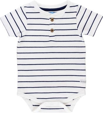 Give baby a classically comfortable look with this stretch-cotton henley bodysuit patterned in slim stripes.