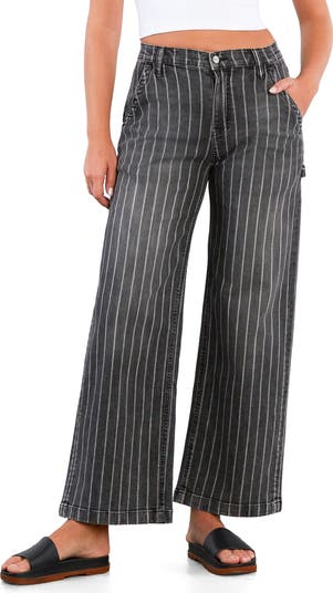 Vertical stripes elongate the look of these cotton-blend high-rise jeans cut in a relaxed wide-leg silhouette.