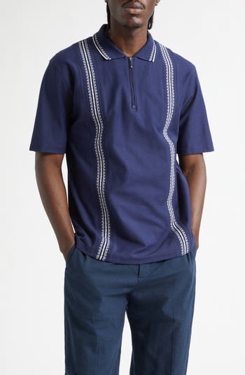 This cotton piqué polo receives a vintage-style treatment with twin vertical panels of striped jacquard rib down the front. A zip placket and matching collar finish off the look.