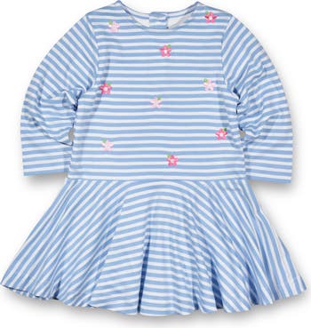 Sweet and timeless, this dress is crafted from a medium blue and white yarn-dyed stripe interlock knit. Light and dark pink embroidered flowers bloom across the bodice, adding cheerful detail to the classic design. The drop waist silhouette with a flared skirt gives it playful movement, while back neck buttons make dressing easy. Falling above the knee, it’s as comfortable as it is picture-ready—perfect for everyday outings, special occasions, or as a thoughtful holiday gift. Medium blue and white yarn-dyed stripe interlock knit, 50% cotton 50% polyester, light pink and dark pink embroidered flowers on front bodice, back neck buttons, drop waist dress silhouette with flared skirt, above-knee length.
