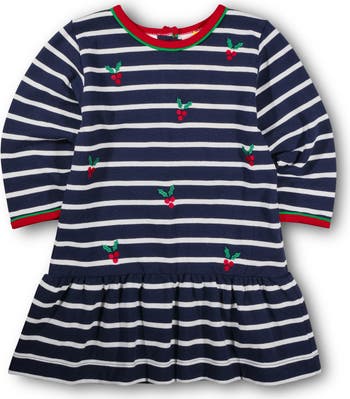 - 100% cotton navy and white stripe pique knit dress with embroidered holly berries and leaves, red and green trim, back button closure, drop waist.