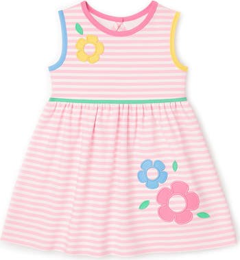 Bright and joyful, this dress is crafted from pink and white yarn-dyed stripe interlock knit for soft, breezy comfort. Pink, blue, and yellow appliqué flowers bloom across the bib and skirt, while multicolor trim at the neck, armholes, and waist adds a cheerful burst of color. The classic waist dress silhouette features a softly shirred skirt for playful movement, along with a sweet back neck cutout and back waist spaghetti ties for a polished, comfortable fit. Designed to fall at the knee, it’s perfect for warm-weather outings, vacations, and sunny spring celebrations.