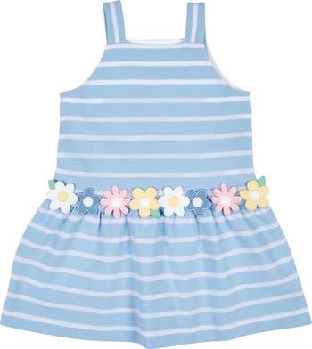 Bright and breezy, this dress is crafted from light blue and white yarn-dyed stripe piqué knit in soft, breathable 100% cotton—perfect for warm-weather days. Multicolor pastel flowers bloom across the front waist, adding cheerful color and a sweet, summery touch. Adjustable shoulder straps with back buttons ensure a comfortable, flexible fit, while the drop waist silhouette and softly shirred skirt create easy movement. Falling above the knee, it’s ideal for sunny vacations, spring outings, and picture-perfect moments in the sunshine.