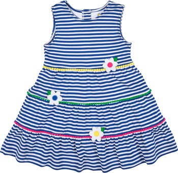 Bright, playful, and full of texture, this dress is crafted from royal and white yarn-dyed stripe interlock knit for soft, all-day comfort. Fuchsia, green, and yellow mini pom-pom trim adds cheerful color, while appliqué flowers bloom across the bodice for a sweet, summery touch.\nThe classic waist dress silhouette features a tiered, shirred skirt for breezy movement, and a back neck button closure keeps the fit neat and easy. Designed to fall at the knee, it’s perfect for warm-weather outings, vacations, and sunny celebrations.