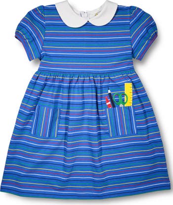 Delightful and fun, this Florence Eiseman stripe-knit dress boasts primary-colored yarn-dyed stripes and adorable appliqué school supplies nestled in skirt pockets. The waist dress silhouette features a shirred skirt, invisible back zipper, and spaghetti waist ties—charming details for school days or playdates. Machine washable comfort meets playful elegance.