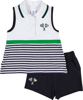 Navy and white stripes set a crisp, cheerful tone for this knit dress, accented with embroidered heart-shaped tennis rackets for a playful finish. A softly shirred skirt creates gentle movement with every step. The waist detail with delicate ties adds comfort and flexibility, making this dress easy to wear throughout the day. Designed to balance polish and play, it’s made for comfort without feeling fussy. Perfect for summer outings and picture-perfect moments on or off the court.