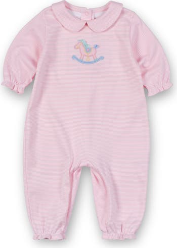 Designed as part of our new baby gift collection, this sweet longall is crafted in a soft pink and white yarn-dyed mini stripe interlock knit. A classic appliqué rocking horse, complete with 3-D ribbon details, adds heirloom charm, while a crisp Peter Pan collar keeps the look timeless. Ruffled hems with elastic at the sleeves and legs give a delicate finish. Back snaps and an invisible inseam zipper make dressing and changes easy, ensuring comfort for little ones and ease for parents. Made from 100% cotton, it’s soft, breathable, and perfect for gifting. Pair with the matching bib and towel for a thoughtful gift set, or give individually for a keepsake-worthy present. Pink and white yarn-dyed mini stripe interlock knit, 100% cotton, appliqué rocking horse with 3-D ribbon details, Peter Pan collar, snaps at center back, invisible zipper in inseam, ruffle with elastic at sleeve and leg hems.