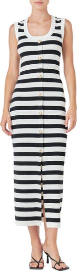 Ornate golden buttons elevate this lively striped sleeveless midi covered in fine ribbing for a close fit.