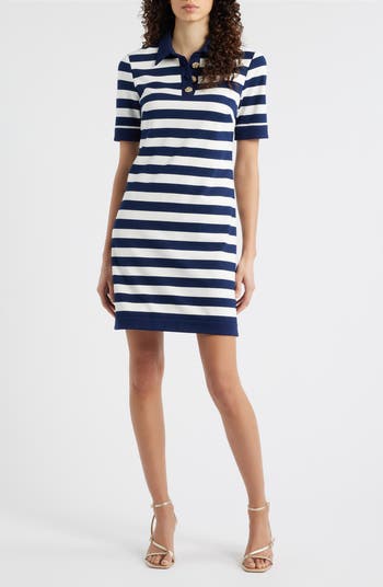 Decorative goldtone buttons line the half placket of this polo-inspired shift dress patterned in classic stripes.