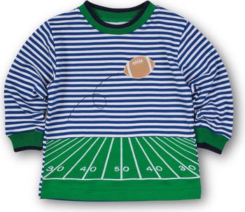 Florence Eiseman's stripe knit shirt effortlessly blends sporty style with playful charm, featuring an embroidered football field hem detail and a delightful football appliqué on the chest. Finished with comfortable green and navy ribbed trims, it’s a fun and functional addition. Machine washable and adventure-ready.