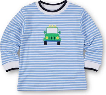 Adventure-ready style meets everyday comfort in this medium blue and white yarn-dyed stripe shirt. A playful appliqué safari jeep brings cheerful detail to the front, while crisp white rib trim at the neck and sleeves—finished with navy tipping—adds a polished touch. Crafted from a soft cotton-poly blend, it’s breathable, durable, and perfect for pairing with shorts, pants, or layered under a jacket. A versatile top designed for play, exploration, and would make a lovely gift. Medium blue and white yarn-dyed stripe interlock knit, 50% cotton 50% polyester, appliqué safari jeep, white neck and sleeve rib with navy tipping.