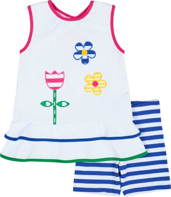 Sweet and summery, this girls' short set pairs a white jersey knit top with royal-and-white striped shorts. Accented with flower appliqués, stripe binding details, a cute back cut-out with spaghetti tie, and elastic-waist shorts, offering style and ease for sunny days.
