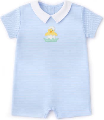 Sweet and playful for special spring days, this shortall is crafted from light blue and white yarn-dyed mini stripe interlock knit in soft 100% cotton. A charming appliqué hatching chick appears on the front chest and back seat, adding a touch of whimsy that’s perfect for sunny outings and family celebration. A classic white Peter Pan collar gives the look timeless appeal, while back neck snaps and inseam snaps make dressing and changes quick and easy. Lightweight and comfortable, it’s ideal for days spent exploring, playing, and making memories in the sunshine.