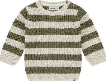 This pullover crewneck knit sweater features an olive and cream-toned stripe pattern and two button enclosures at the shoulder.