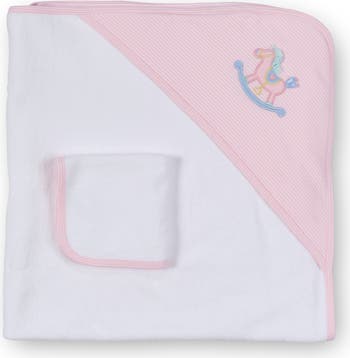 - 100% cotton white terry towel and washcloth set with pink/white mini-stripe hood and trim, appliqué rocking horse with 3-D ribbons, stripe binding