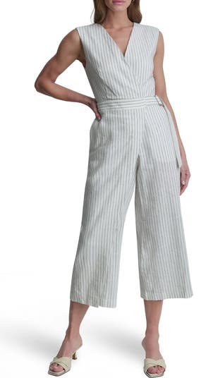 DKNY Stripe Linen Blend Crop Jumpsuit, Main, color, Ivory/Admiral