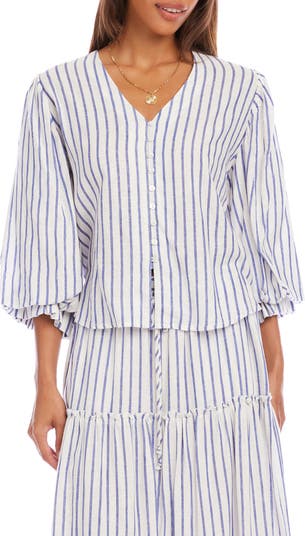 Blouson sleeves provide a bold, airy finish for this linen-blend shirt patterned in crisp stripes.